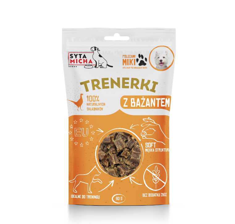 Treningówki dla psa z bażantem od Sytej Michy są naturalnym źródłem, pełnowartościowego białka. Zaliczane do chudych mięs, obfituje również w pierwiastki tj. żelazo, magnez, miedź, wapń i fosfor, a także witaminę A, biotynę i niacynę.